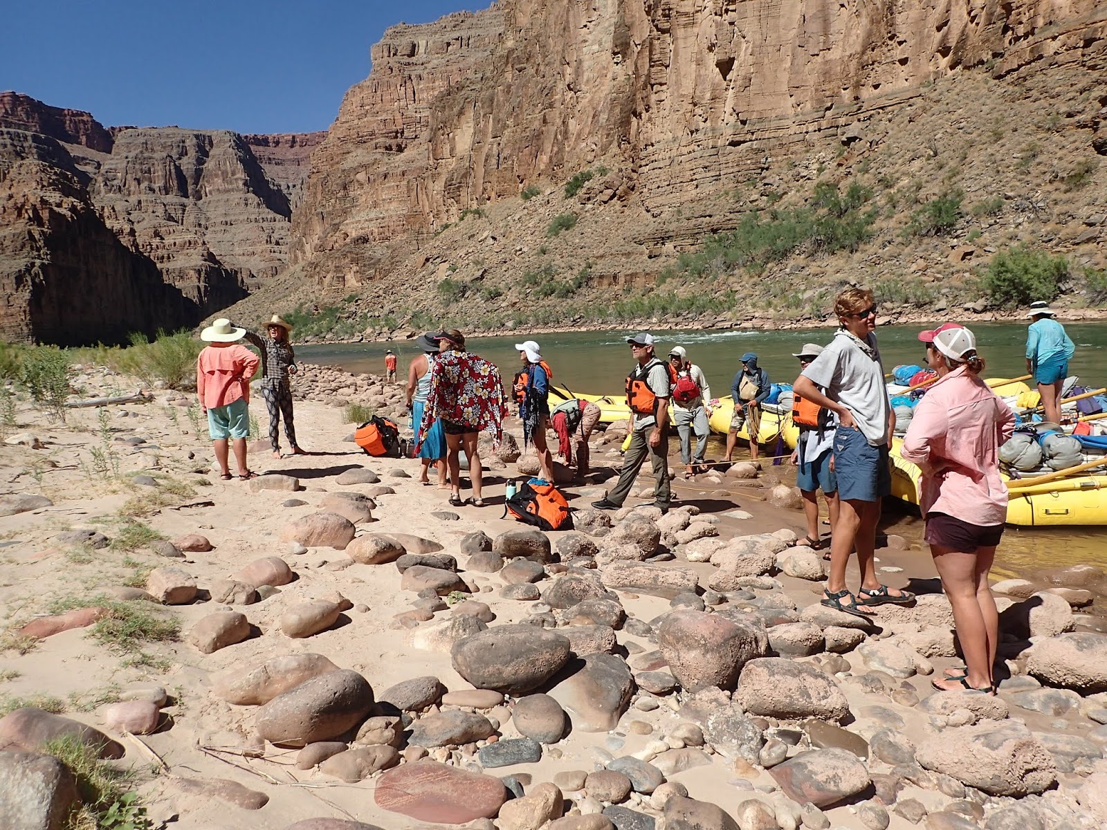 One important item of note. The Colorado river is dammed (Glen Canyon Dam) to form Lake Powell Reservoir. That means that the water flowing through the GC is from below the dam, which means it comes from low down in Lake Powell, which means it is consistently very cold - about 50 degrees at the start. Falling into water that cold is very...invigorating. One of the side benefits is that the oar boats had coolers that they carried down low - so the water would help to keep them cool.