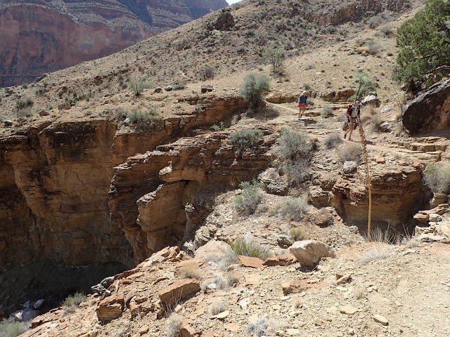 The first couple of miles today would be along the river, then we'd head up (and up, and up) away from the river for about 7 miles. It was going to be warm so we needed to filter a bunch of water before leaving the river. When we got to Cardenas beach the boat that we saw go down the rapids the previous night was there - they had camped there over night. One of the guys from the crew offered to take our trash - which was really nice. Unfortunately when we saw their boat floating down the river about an hour later that led to Nancy referring to it as the "trash barge". I'm sure it was meant in the best way.
